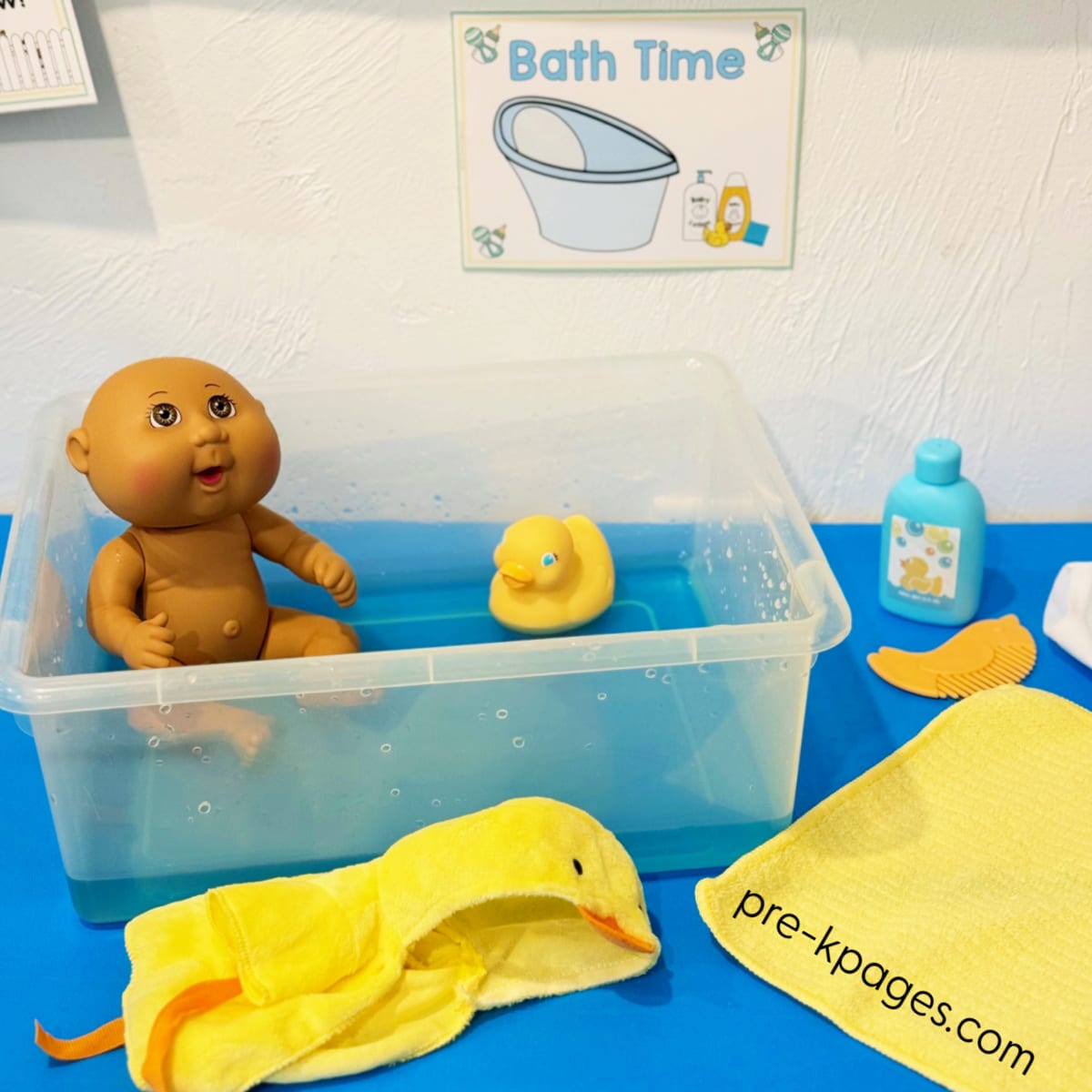 Babies can get messy! Add an extra dash of fun to your pretend play childcare center with bath time. Your little ones will have a blast bathing the baby dolls in your pretend play center. You can even use your sensory table as the bathing area.