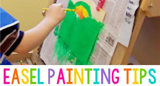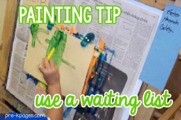 When someone finishes painting, ask the next child on the list if he is ready for a turn. If so, he move to the easel. If not, skip his name and go on to the next one. This prevents a line of kids waiting or a teacher’s brain from trying to remember who is next. And waiting kids can check the list to see how long until their turn.