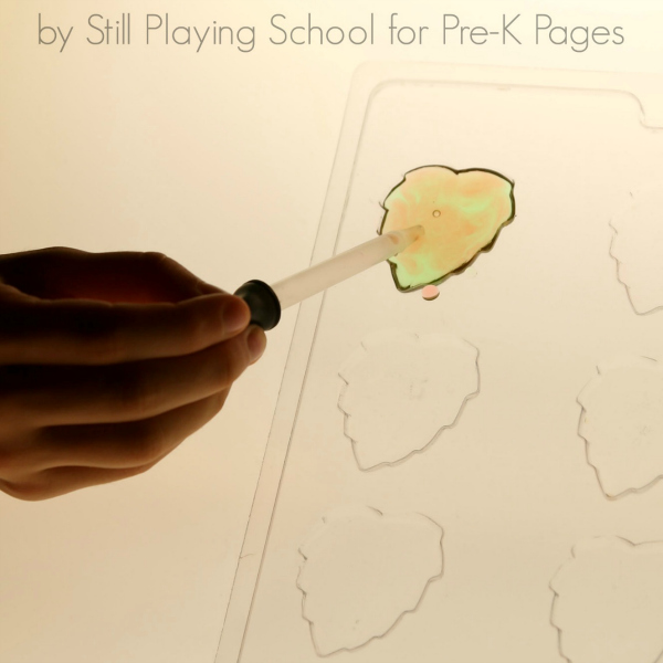 Colored Water and Eyedroppers (Pre-K Pages) – This invitation to explore color mixing on the light table is perfect as the seasons are changing. The colors of autumn leaves are mesmerizing both in nature and in this light table activity!