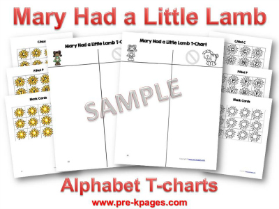 The alphabet t-charts in both black and white and color will provide students with visual discrimination practice. You can find the alphabet t-charts in the Mary Had a Little Lamb Literacy and Math Packet located in the printables section below.