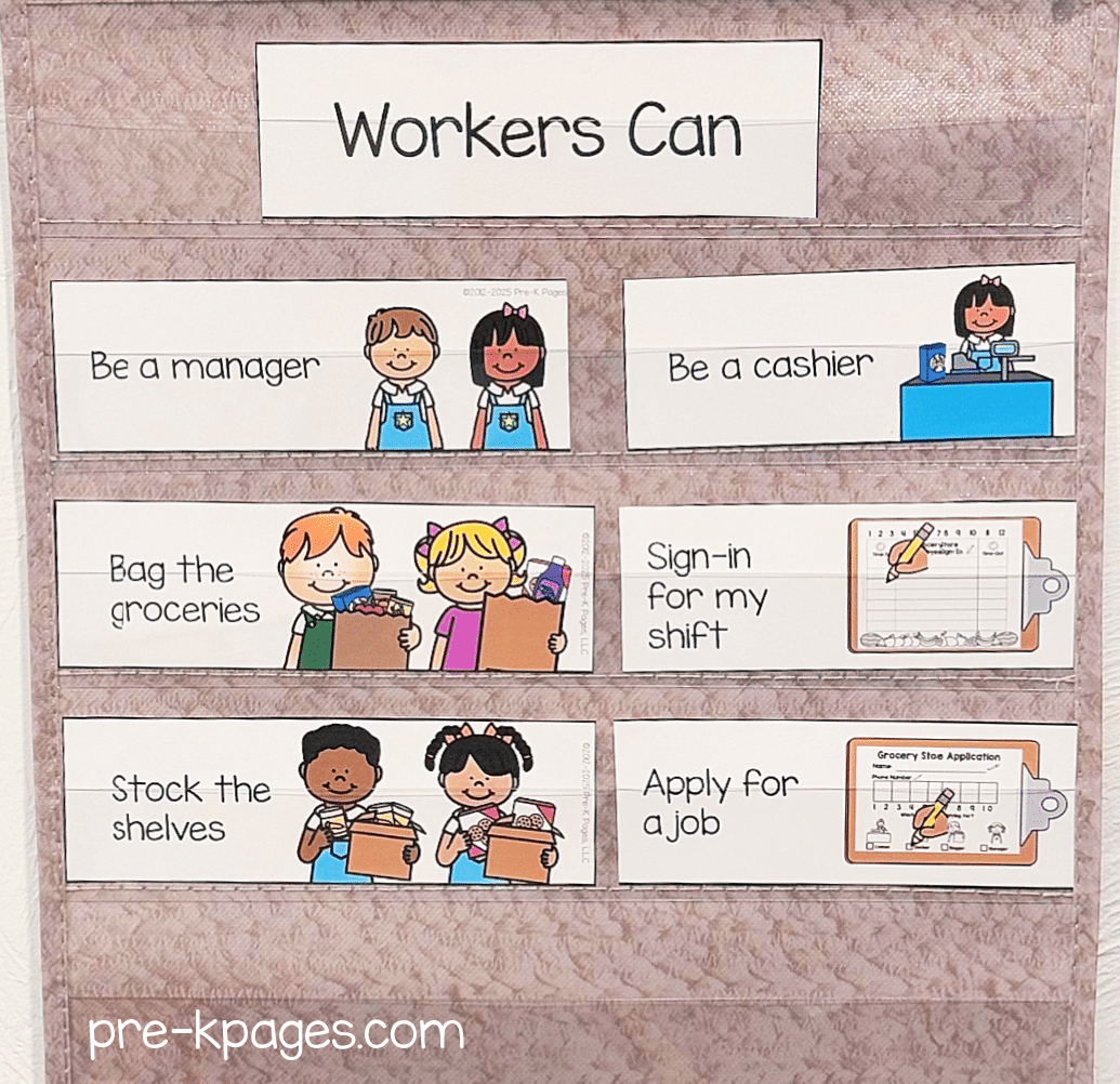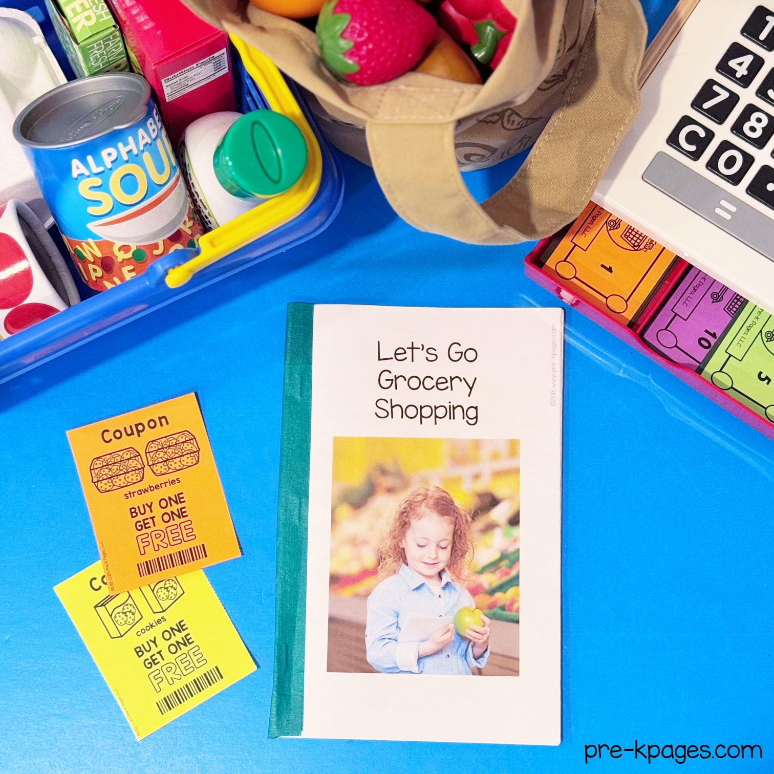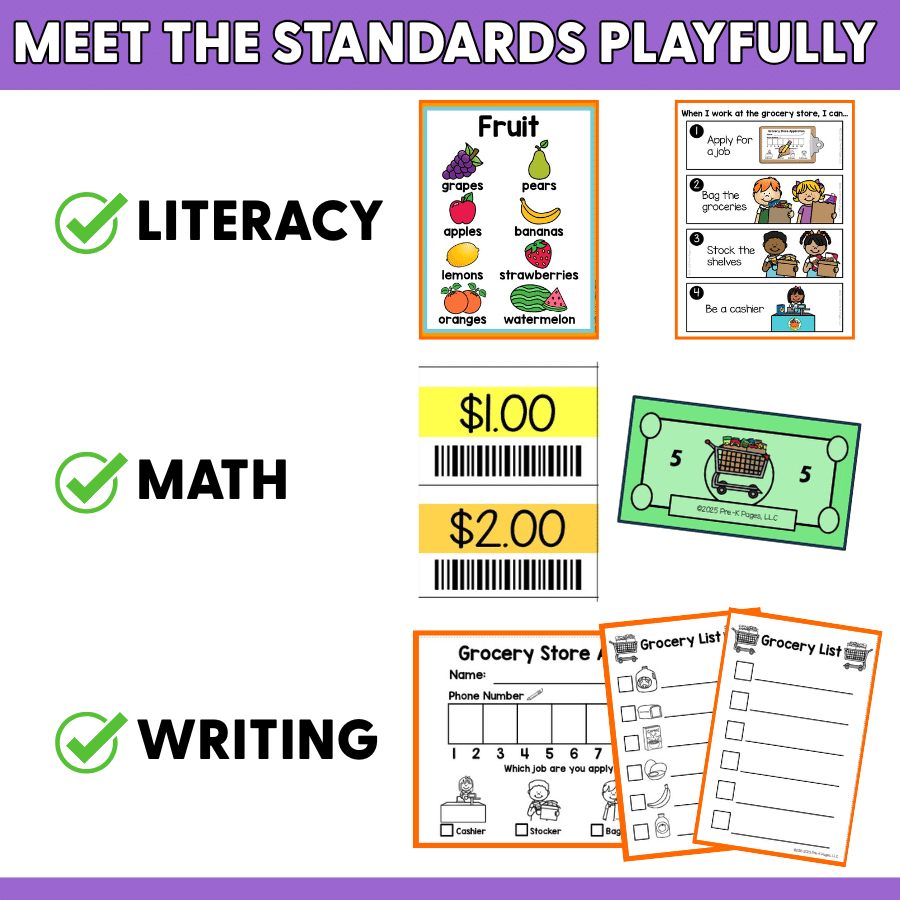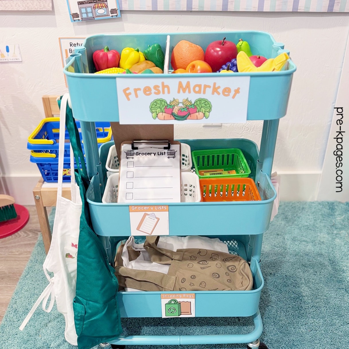 ⭕ “Shopping” for a new dramatic play theme? This Grocery Store Dramatic Play Center is packed with ready-to-use printables like signs, shopping lists, labels, play money, picture word cards – and more! Easily transform your home living or pretend play area into a realistic grocery store where your little learners can engage deeply through hands-on play.