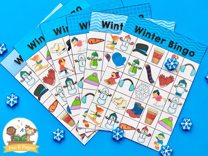 Free printable bingo game for a winter theme in your preschool, pre-k, or kindergarten classroom.